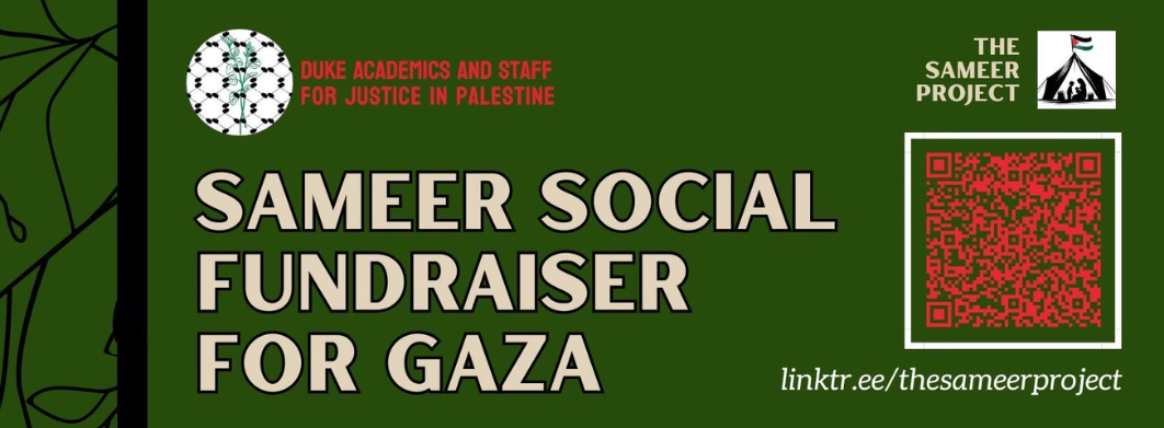Members and friends of Duke ASJP raised $1,300 for the Sameer Project at a social fundraiser in June 2025. We invite you to keep sending what you can to this grassroots mutual aid effort on the ground in Gaza.
