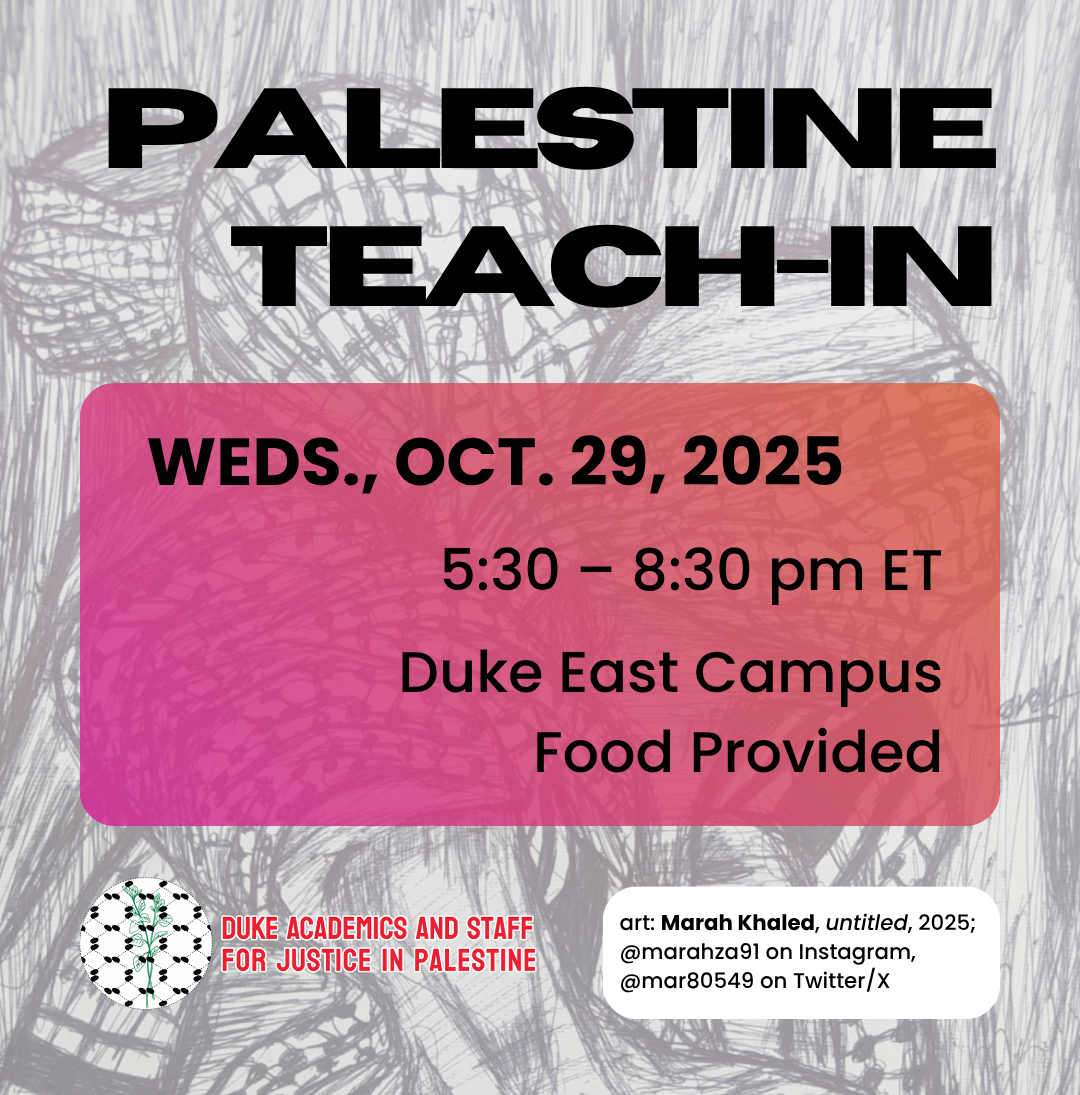 Duke Academics & Staff for Justice in Palestine was founded in December 2023. This participatory event marks the one-year anniversary of the group. Bringing together students, faculty, staff, and community members in teaching and learning circles, we’ll reflect on the following: How are students energizing and organizing one another? How do we increase our power? Where do we go from here in terms of goals and strategies? This event is open to all but requires an RSVP. We will meet on Duke’s East Campus — the exact location will be sent out the morning of the event. Dinner will be provided!